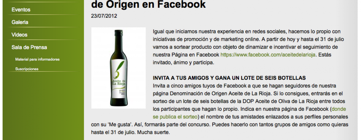 Mañana es el último día para poder participar en nuestro primer concurso desde la web social. Como otras prestigiosas marcas presentes en Internet, la DOP Aceite de la Rioja se planteó sortear producto con objeto de dinamizar e incentivar el seguimiento de nuestra Página en Facebook https://www.facebook.com/aceitedelarioja Por lo general se diseñan concursos para aumentar el número de fans o ‘me gusta’, para incrementar la fidelización de los usuarios, y para recabar información sobre ellos.