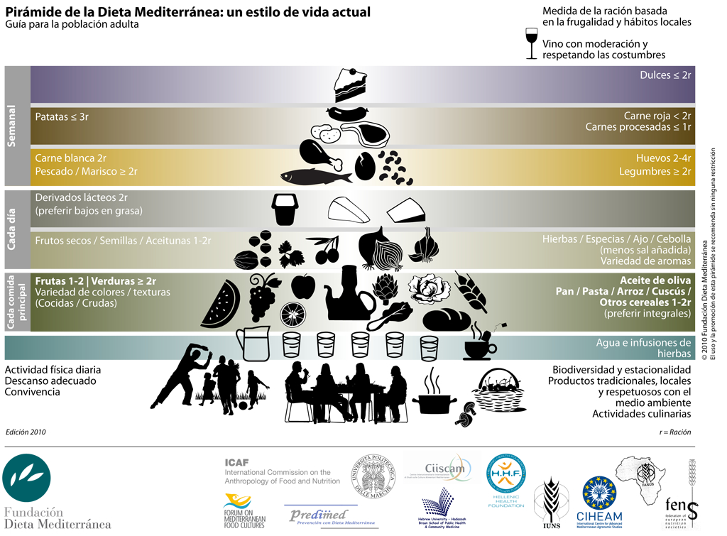 El aceite de oliva, situado en el centro de la Pirámide de la Dieta Mediterránea, debería ser la principal fuente de grasa por su calidad nutricional. Se debe utilizar para aderezar y cocinar —una cucharada— ya que su composición única le da una alta resistencia a las temperaturas de cocción. La Fundación Dieta Mediterránea (FDM) fue creada en 1996 para conservar el estilo de vida que compartimos los pueblos mediterráneos desde hace miles de años. Los científicos han puesto de manifiesto que este estilo de vida es beneficioso para la salud y el bienestar de las personas. Además contribuye al mantenimiento de una agricultura sostenible y a preservar el medio ambiente.