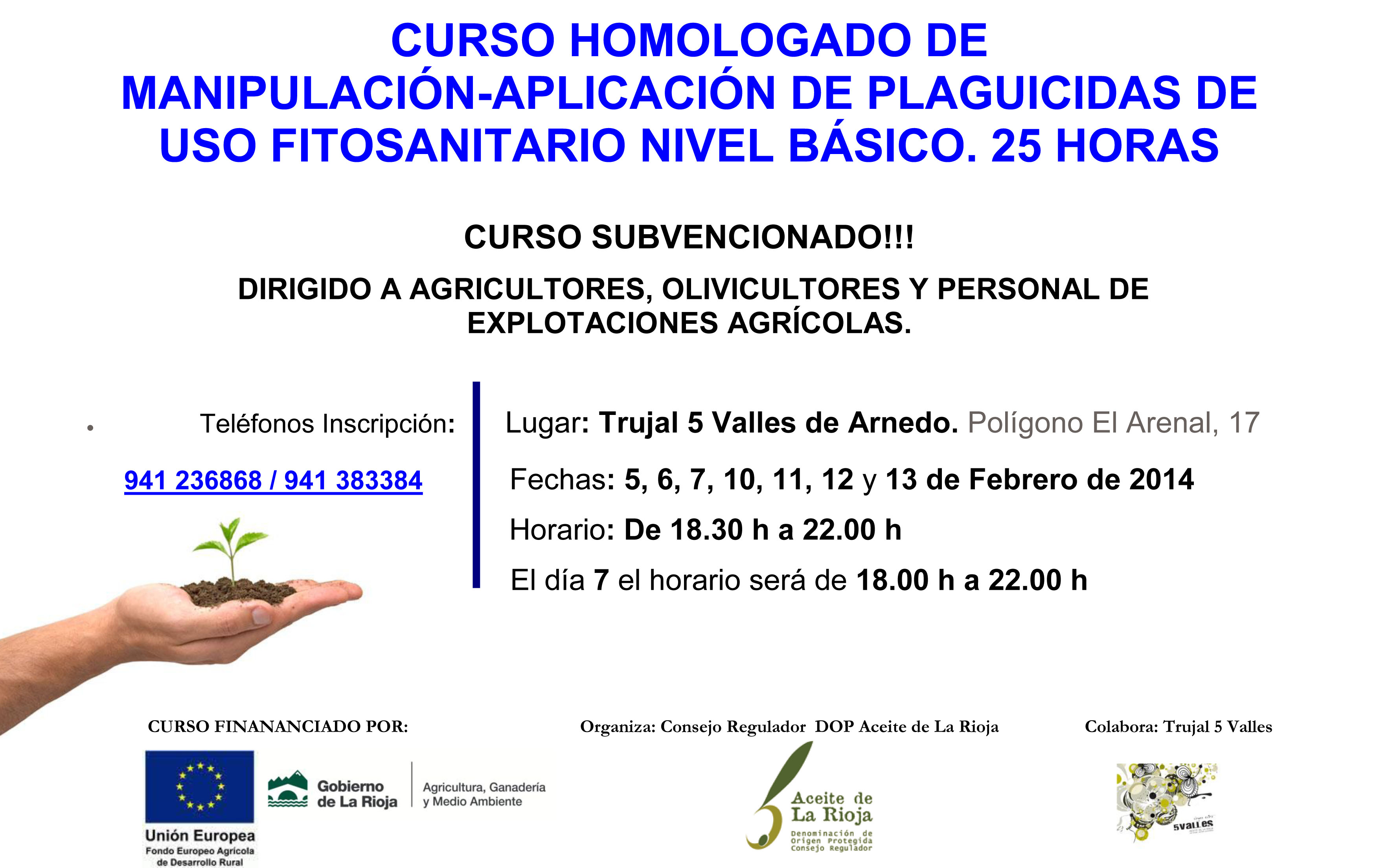 Dirigido a agricultores, olivicultores y personal de explotaciones agrarias, es un curso gratuito subvencionado por la Consejería de Agricultura, Ganadería y Medio Ambiente a través del Fondo Europeo Agrícola de Desarrollo Rural. La inscripción puede realizarse en los teléfonos 941383384 y 941236868 y mediante la dirección de correo electrónico info@aceitedelarioja.com.