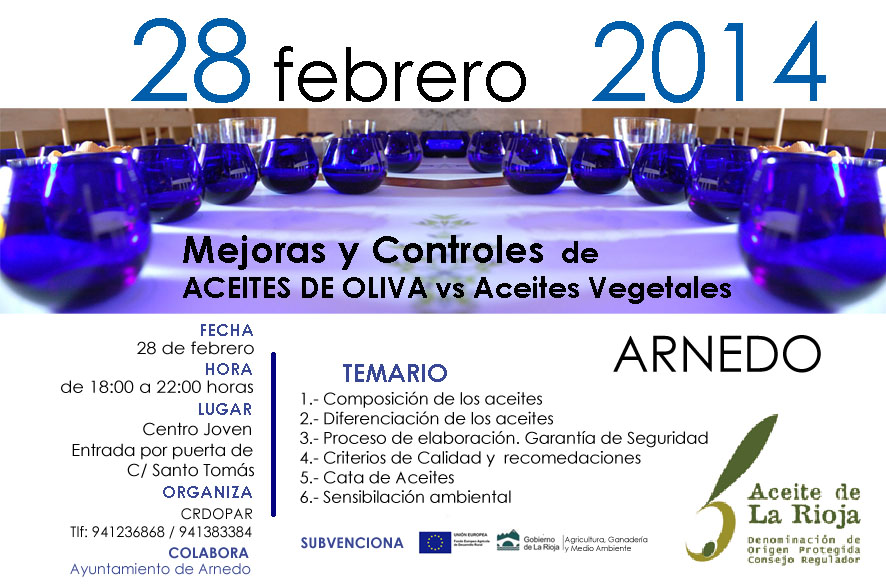 El Consejo Regulador de la DOP Aceite de La Rioja celebra un Curso de Mejoras y Controles de Aceites de Oliva & Aceites Vegetales en Arnedo. Con una duración de 4 horas, la actividad formativa se va a celebrar el viernes 28 de febrero en el Centro Joven de Arnedo en horario de 18.00 a 22.00 horas.