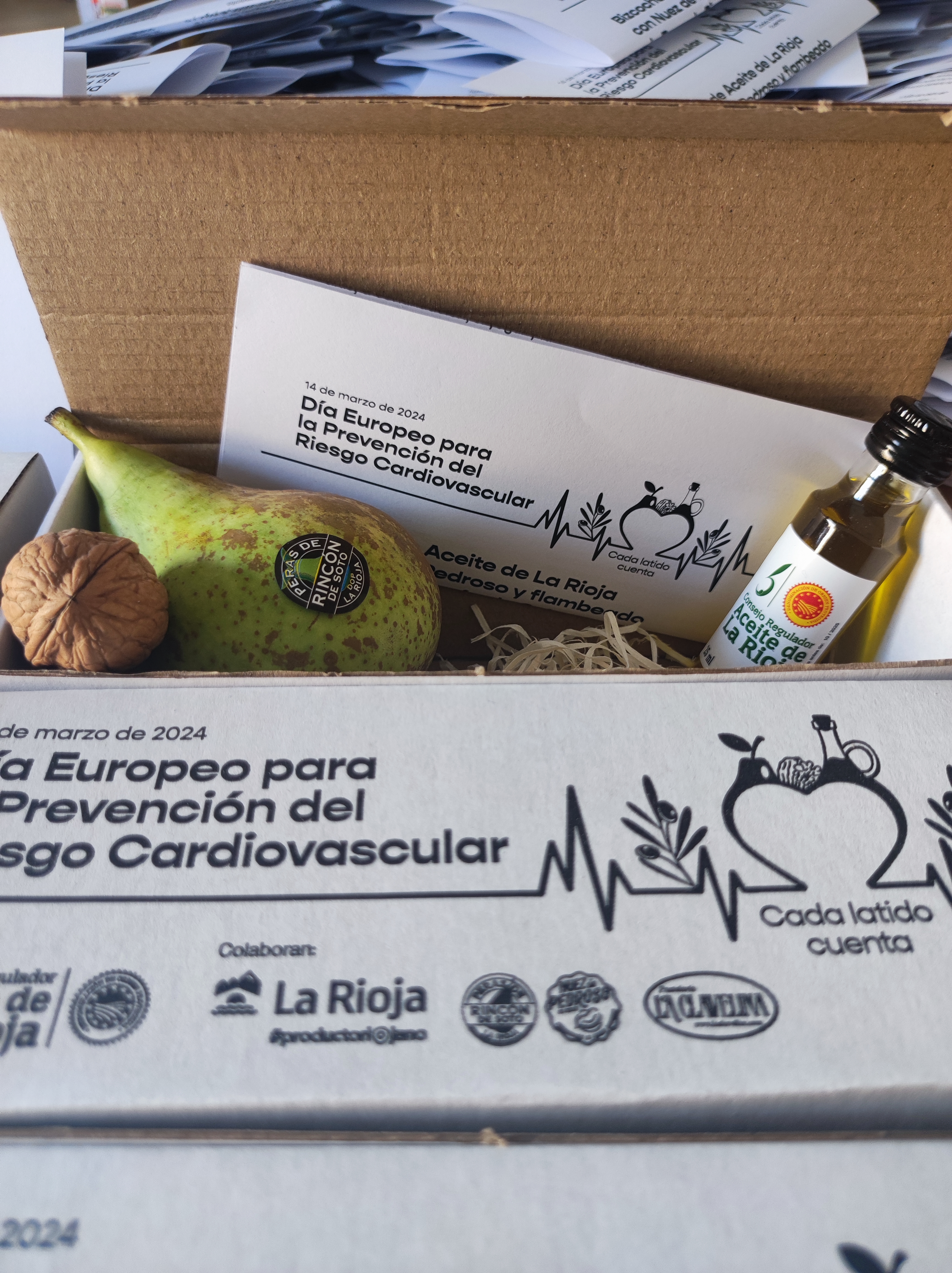 - El jueves 14 de marzo, Día Europeo para la Prevención del Riesgo Cardiovascular, se repartirán 1.000 cajas de la salud que contienen Aceite de La Rioja, Nuez de Pedroso, Pera de Rincón de Soto y una receta elaborada por Pastelería La Clavelina de Arnedo y compuesta por estos ingredientes