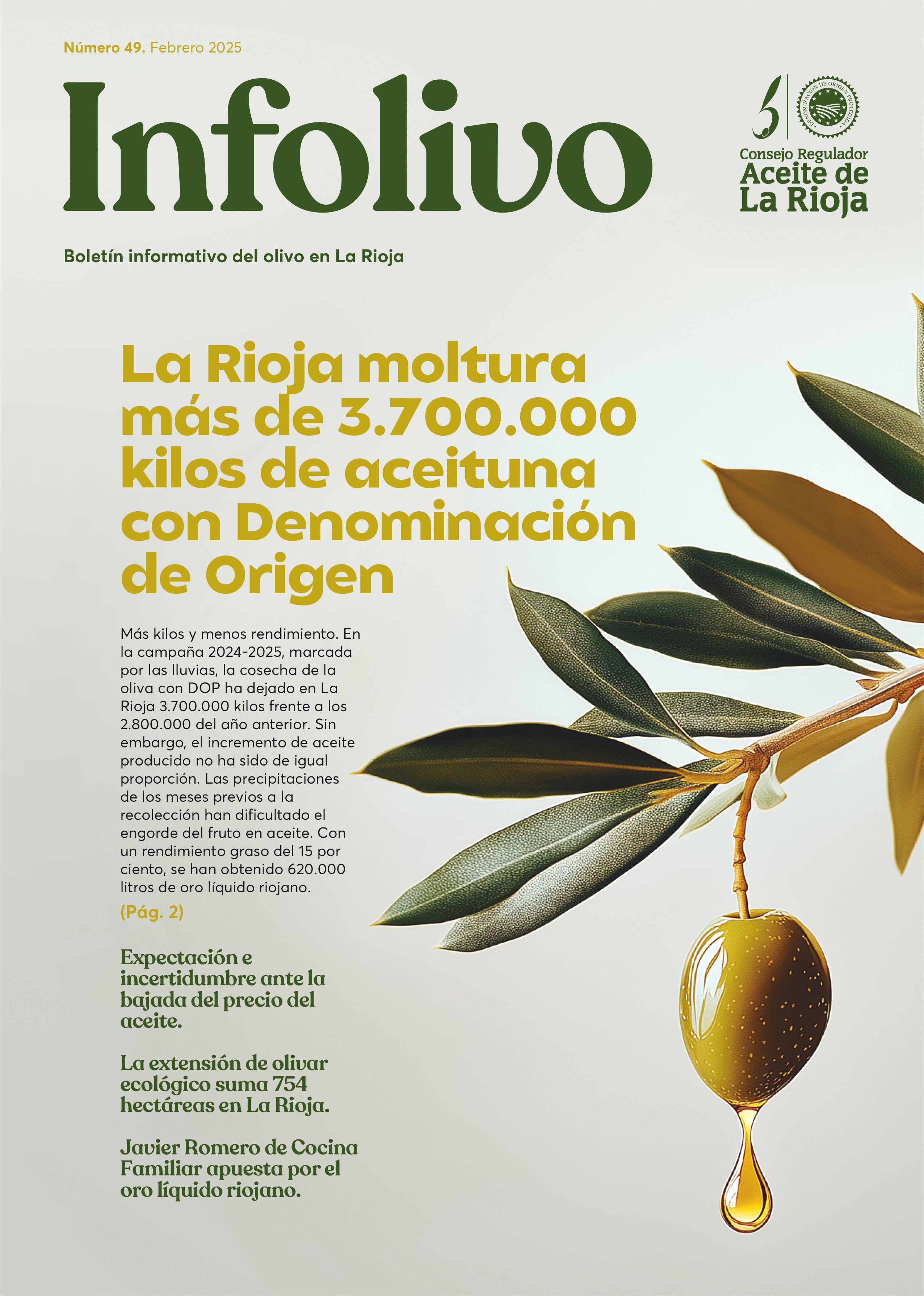 El Infolivo 49 ha salido a la calle con diferentes temas de interés. Abre portada con los datos de la cosecha de la oliva 2024-2025 y la bajada del precio del aceite. Además, incluye reportajes sobre olivicultura ecológica y tratamiento de plagas y enfermedades en eco, la nueva medida de la ley de etiquetado que entró en vigor en enero y una entrevista al cocinero Javier Romero. En contraportada, un reportaje sobre el Aceite de La Rioja Allegar.